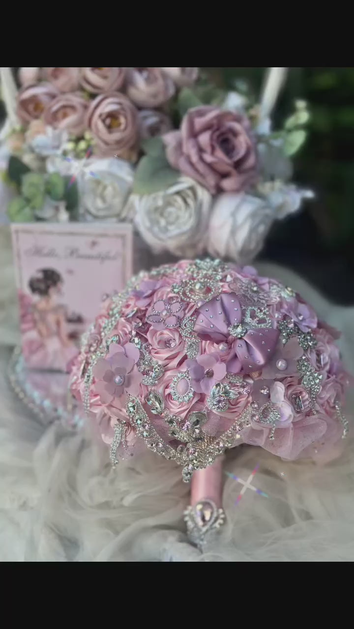 Our Dusty Pink Crystal Embellished Bouquet is a breathtaking statement piece, handcrafted with soft pink and dusty rose florals, richly adorned with silver crystals, pearls, and couture embellishments.
